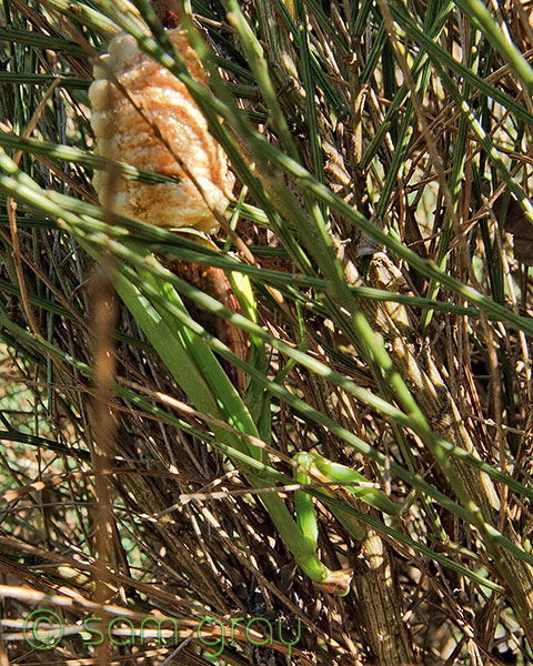 For the last couple of years we have almost always had a mantis or two in the garden. They lay an egg case in the same shrub (scotch broom) every year. This year I got to see the female lay the egg case. I was on my way out the door to get a haircut and took a quick for the mantis…WOW…there she was in the scotch broom laying the egg case.