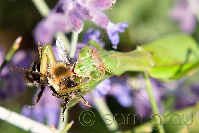 Sam, these are super images of the mantis. I’ve never seen one lay her egg case, either. I absolutely love the color combo of purple and green. She’s a smart lady to hang out in the purple flowers, esp since she got her tummy full of bees.