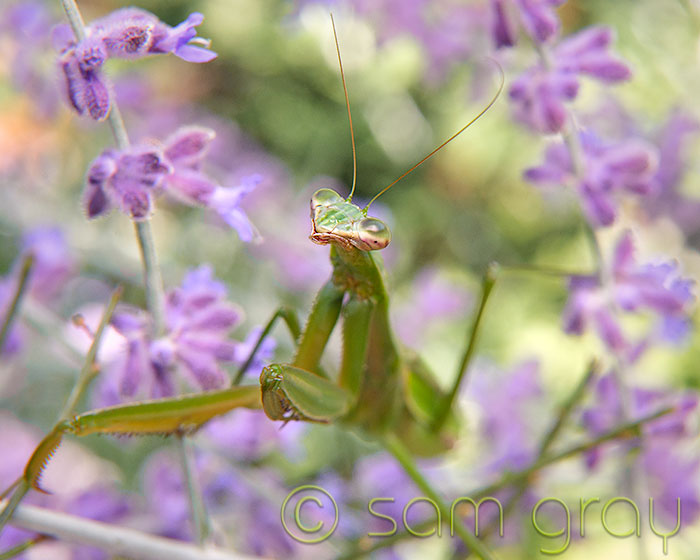 I had a white translucent diffuser with me so I put it behind the mantis and Russian sage for this next image. All in all it was quite a interesting morning…yes, I was a little late for my haircut.